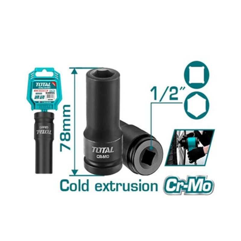 1/2″ deep impact socket, size 13mm, length 78mm, material CrMo, cold extrusion, heat treatment, packed by plastic hanger.