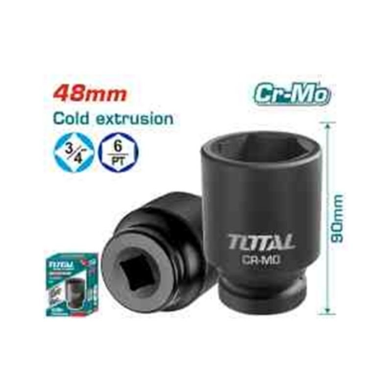 3/4″DR. impact socket, size 48mm, length 95mm, material CrMo, cold extrusion, heat treatment, packed by color box.