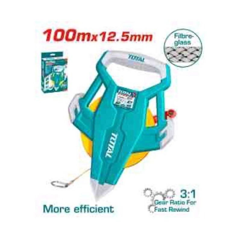 3:1 Gear ratio for fast rewind, Reinforce fiberglass tape Length & width: 100m x 12.5mm With metric and inch Pure material retracting gear With all rubber cover Integrated handle good for using and convenient storing Ergonomic handle Packed by color box.