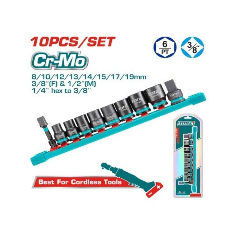 10-piece 3/8″ drive impact socket set made of Cr-Mo with cold extrusion and heat treatment, including eight 3/8″ drive sockets in 8,10,12,13,14,15,17,and 19mm, one 3/8″(F) to 1/2″(M) impact socket adapter, and one 1/4″ hex to 3/8″ impact socket adapter, supplied on a storage rail and packed by double blister.