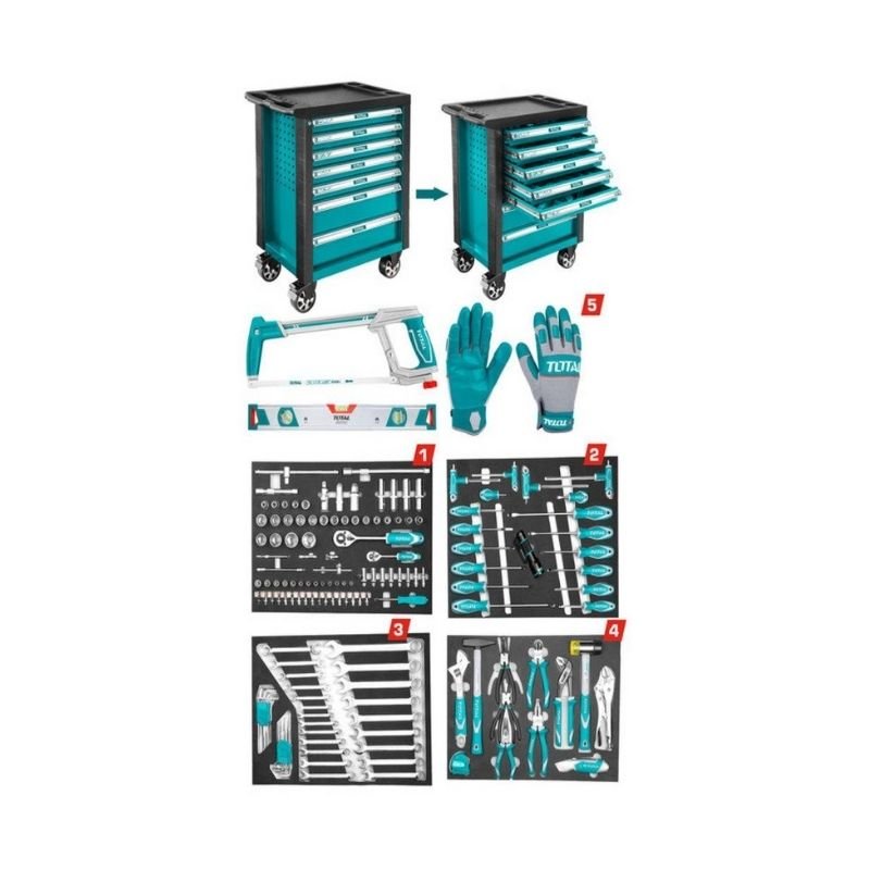 Drawer 4 Included: 1Pcs 10″ Curved jaw lock wrench 1Pcs 40mm Rubber and plastic hammer 1Pcs 10″ Water pump pliers 1Pcs 8″ Combination Pliers 1Pcs 6″ Long nose pliers 1Pcs 7″ Diagonal cutting pliers 1Pcs Utility knife 4Pcs circlip pliers 1Pcs 300g Machinist Hammer 1Pcs 10″ Adjustable wrench 1Pcs 5x19mm Steel measuring tape
