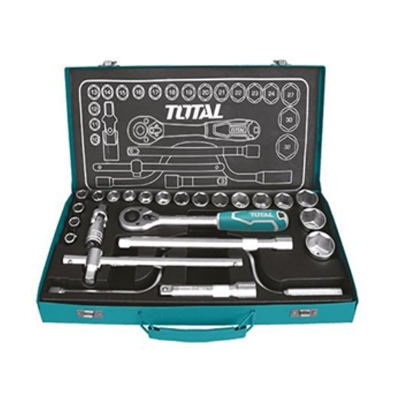 24-piece 1/2″ socket set including eighteen 1/2″ CRV drive sockets in 10, 11, 12, 13, 14, 15, 16, 17, 18, 19, 20, 21, 22, 23, 24, 27, 30, and 32mm; two 1/2″ drive extension bars; one 1/2″ drive sliding T-bar; one 1/2″ drive universal joint; one 1/2″ drive speeder handle; and one 1/2″ drive quick ratchet handle, packed in a metal box.