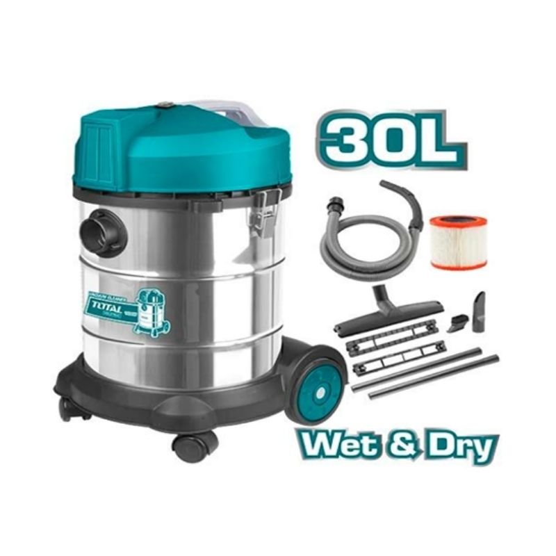 Wet and dry cleaning with 110V-120V~60Hz input power at 1400W, 1.9CBM/min air flow, 16–18KPa vacuum pressure, 30L dust capacity, 1.8m power cable, 1 flexible hose, 1 floor brush, 1 plastic tube, and 1 HEPA filter.