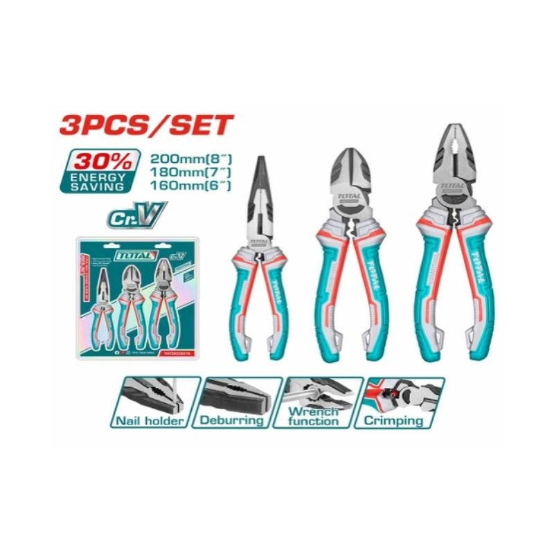 Size: 8″ high leverage combination pliers, 7″ high leverage diagonal cutting pliers, and 6″ high leverage long nose pliers, made of Cr-V with black finish and polish, TPR three-color handle, saving 30% strength compared to normal pliers, packed by PP hanger.