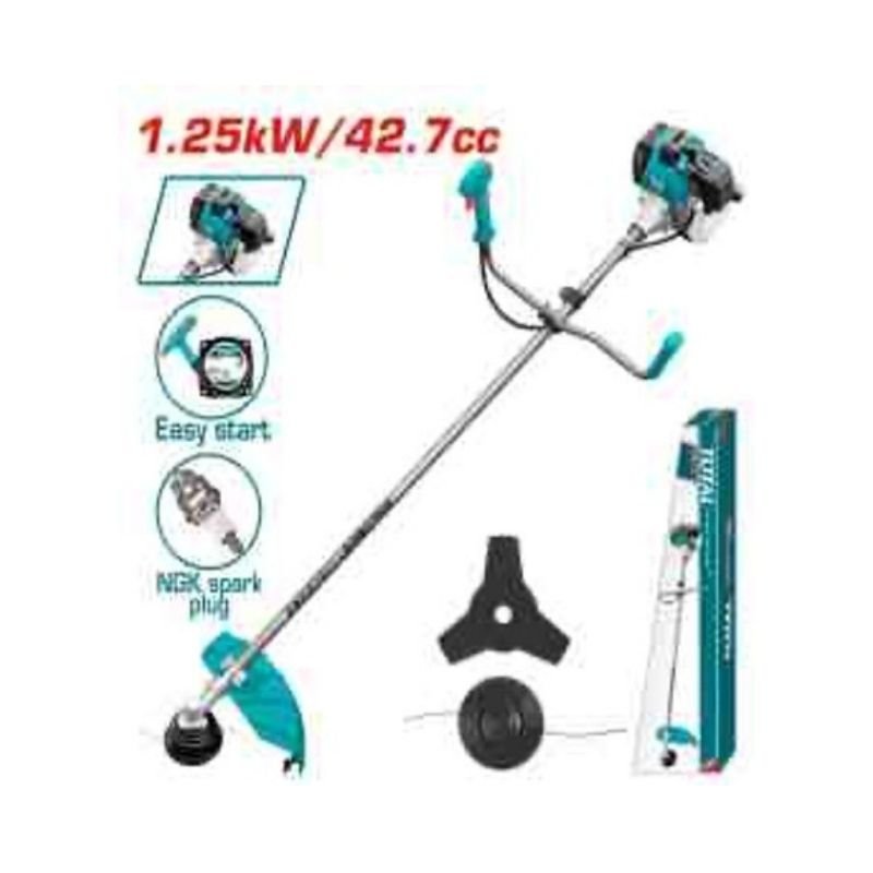 Displacement: 42.7cc Rated power: 1.25kW (2HP) Max speed: 9000rpm Max cutting path: 420mm Spool liner: 2.4mm x 4m Blade diameter: 255mm (3 teeth) Fuel tank capacity: 1200ml Powerful 2-stroke motor With 2 functions: trimmer and cutter Air-cooled engine, single cylinder With line spool With bush cutter blade Packed by color box.