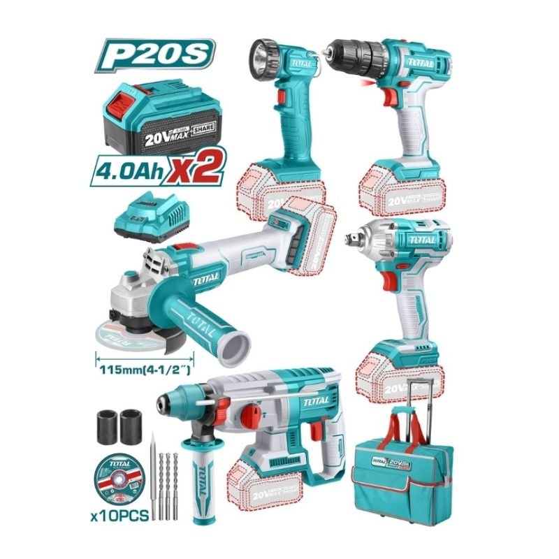 Voltage:20V With 1pcs lithium-ion impact wrench, With 1pcs lithium-ion cordless drill, With 1pcs lithium-ion rotary hammer, With 1pcs lithium-ion angle grinder, With 1pcs work lamp, Lithium-ion impact wrench, Brushless Motor Square Drive:1/2″ No-load speed:0-1300/0-2100rpmImpact rate:0-2000/0-3300bpmMax torque:300Nm Lithium-ion cordless drill: No-load speed:0-400/0-1500rpmMax torque:45Nm Plastic chuck. Chuck capacity:0.8-10mmTorque settings:15+1Mechanical 2-speed gear Lithium-ion rotary hammer: Brushless motor No-load speed:0-1100rpm Impact rate:0-5000bpm Impact energy:2.0J Max drilling capacity: diameter 26mm in concrete Integrated work light SDS plus chuck system Lithium-ion angle grinder: Brushless Motor No-load speed:3000/8500rpmDisc diameter:4-1/2″”Spindle thread:5/8″”-11UNC Work lamp LED power dissipation:1.5W Lumens:150±10% Include:2 Pcs sockets(19 21mm)3 Pcs drills and 1pcs chisel 2 Pcs 4.0Ah battery pack 1 Pcs charger Charge volts:110-120V~50/60Hz Packed by canvas bag.