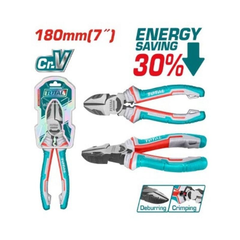 Size 7″/180mm, energy saving 30% than normal pliers, material Cr-V, surface treatment black finish and polish, TPR three color handle for strong grip and comfort, with crimping function, with deburring function, packed by half double blister.