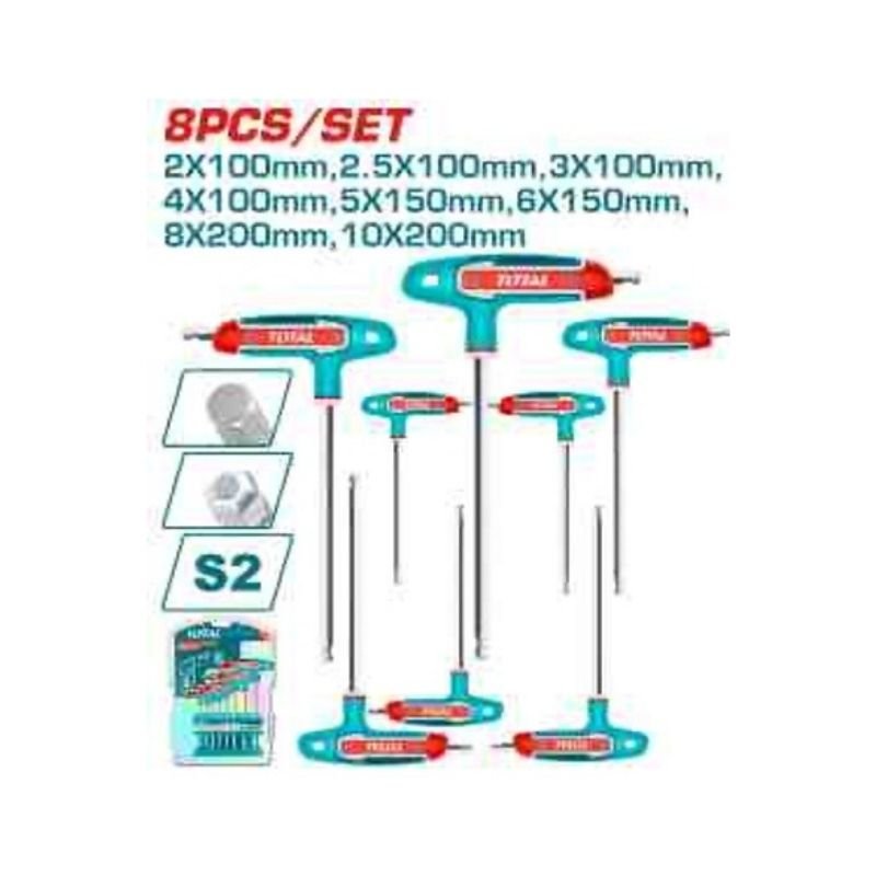 8 Pcs T-handle ball point hex wrench set Size: 2X100, 2.5X100, 3X100, 4X150, 5X150, 6X150, 8X200, 10X200 Material: S2, Heat treatment and chrome plate. Brand exclusive shelf Packed by double blister.