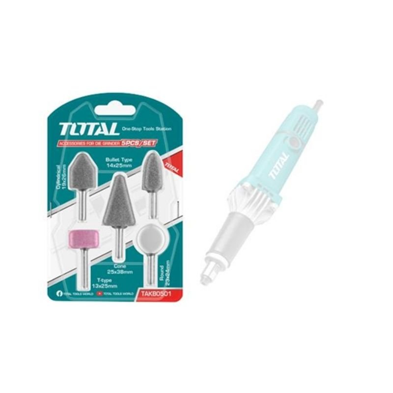 Accessories for die grinder TG50406. 1 PCS Cylindrical 16 × 25mm. 1 PCS Bullet type 20 × 21mm. 1 PCS Cone 20 × 32mm. 1 PCS T-Type 24 × 10mm. 1 PCS Round 20 × 20mm. Packed by sliding card.