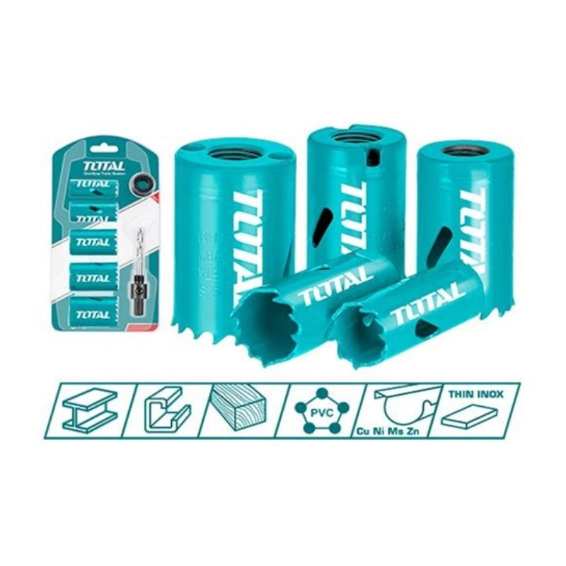 7 Pcs Bi-metal hole saw set Size: 19mm (3/4″), 22mm (7/8″), 29mm (1-1/8″), 32mm (1-1/4″), 35mm (1-3/8″) 1 pcs adapter: 1/2″-20 threads to fit hole saws 5/8″~18″ thread 1 pcs arbor: 3/8″ Hex Shank, Fit Size: 9/16″~1-3/16″ Packed by double blister.