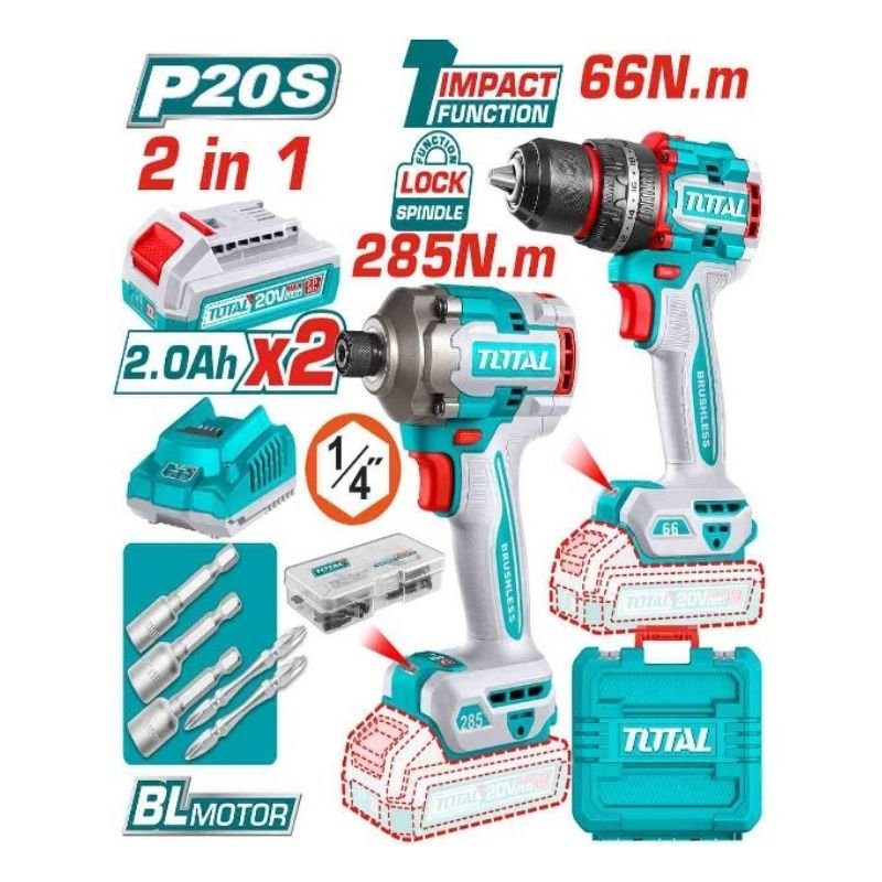 Voltage: 20V With 1pcs Compact Brushless Cordless Impact Drill With 1pcs Cordless impact driver Compact Brushless Cordless Impact Drill: Brushless motor No-load speed: 0-500/0-2000rpm Max impact rate: 30000bpm Max torque: 66Nm Metal chuck Chuck capacity: 1/2″ Torque settings: 22+1+1 Mechanical 2-speed gear Spindle lock function Integrated LED work light Cordless impact driver: Brushless motor Hex shank: 6.35mm No-load speed: 0-1600/0-1900/0-2600rpm Impact rate: 0-2100/0-2500/0-2900bpm Max torque: 285NM Include: 1 Pcs 20V charger Charge volts: 110-120V~50/60Hz 2 Pcs 2.0Ah battery pack 47 Pcs accessories 2 Pcs screwdriver bits 3 Pcs nut setters Packed by carrying case