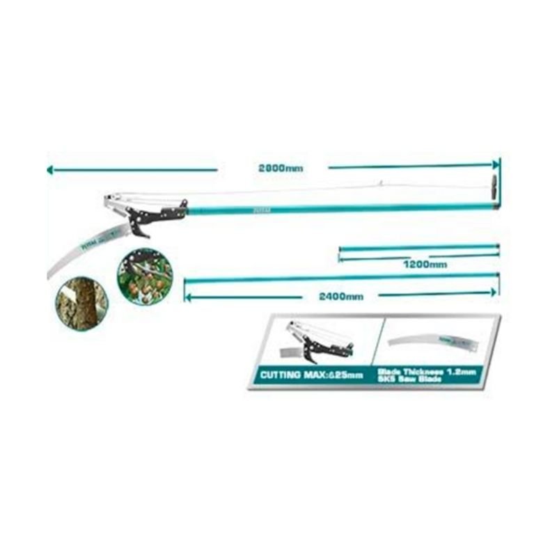 Max cutting diameter 25mm, steel telescopic tube length 2.4m with total length 2.8m, SK5 saw blade with triple teeth, 2.7m nylon strings with 1.2mm diameter, double wheels design, heat-treated blade, blade painted with teflon.