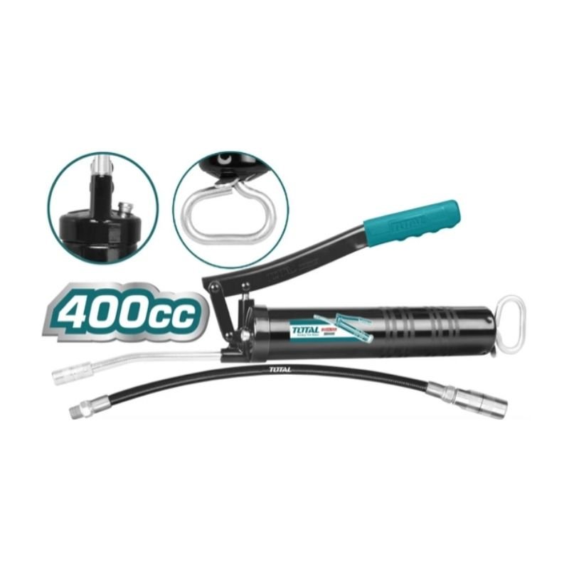 Heavy-duty grease gun Taiwan quality, capacity 400cc / 14oz, loading way 14oz cartridge / 400cc bulk, working pressure 4500psi, burst pressure 10000psi, material 1.2mm steel tube and aluminum-cast, standard accessory includes 1pcs 12″ high-pressure flexible nylon hose and 1pcs metallic bend spout, packed by color box.