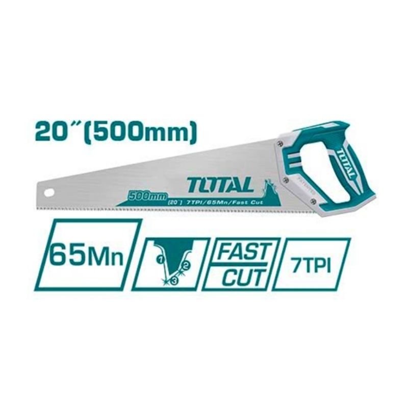 Size 20″/500mm, made of 65Mn with 7TPI heat-treated triple precision-ground teeth, two-color soft handle, fast cut, packed by color sleeve.