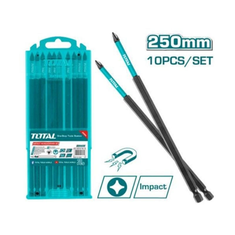 Impact screwdriver bit PH2×250mm, 10pcs per set with high-visibility sleeve, larger optimized shock zone reduces tip breakage, made from S2 industrial steel with black surface and magnet, packed by plastic tube.
