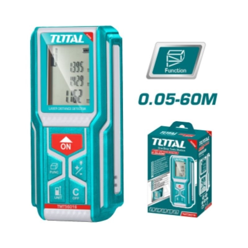 Measuring range 0.05–60m with ±2.0mm accuracy; 635nm <1mW Class 2 laser; operating temperature −10°C to +50°C; functions include distance, area, volume, and height; features a power-off function and unique design; includes one canvas bag and is packed in a color box.