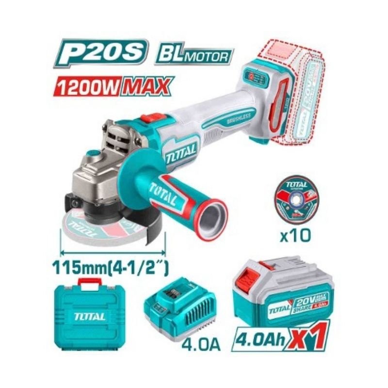 Brushless motor, voltage: 20V, max input power: 1200W, no-load speed: 3000/6000/9000rpm, disc diameter: 4-1/2″, spindle thread: 5/8″-11UNC. Include: 1 set abrasive metal cutting disc (10 pcs), 1 pcs 4.0Ah battery pack, 1 pcs charger. Charge volts: 110-120V~50/60Hz. Packed by carrying case.