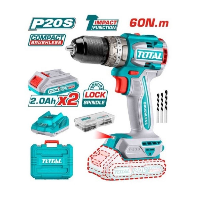 Brushless motor, voltage: 20V, no-load speed: 0-550/0-2000 rpm, max impact rate: 30000 bpm, max torque: 60 Nm, metal chuck, chuck capacity: 1/2”, torque settings: 22+1+1, mechanical 2-speed gear, spindle lock function, auto-lock keyless chuck, integrated LED work light. Include: 47 Pcs accessories, 3 Pcs masonry drill bits, 2 Pcs 2.0Ah battery pack, 1 Pcs charger. Charge volts: 110-120V~50/60Hz. Packed by carrying case.