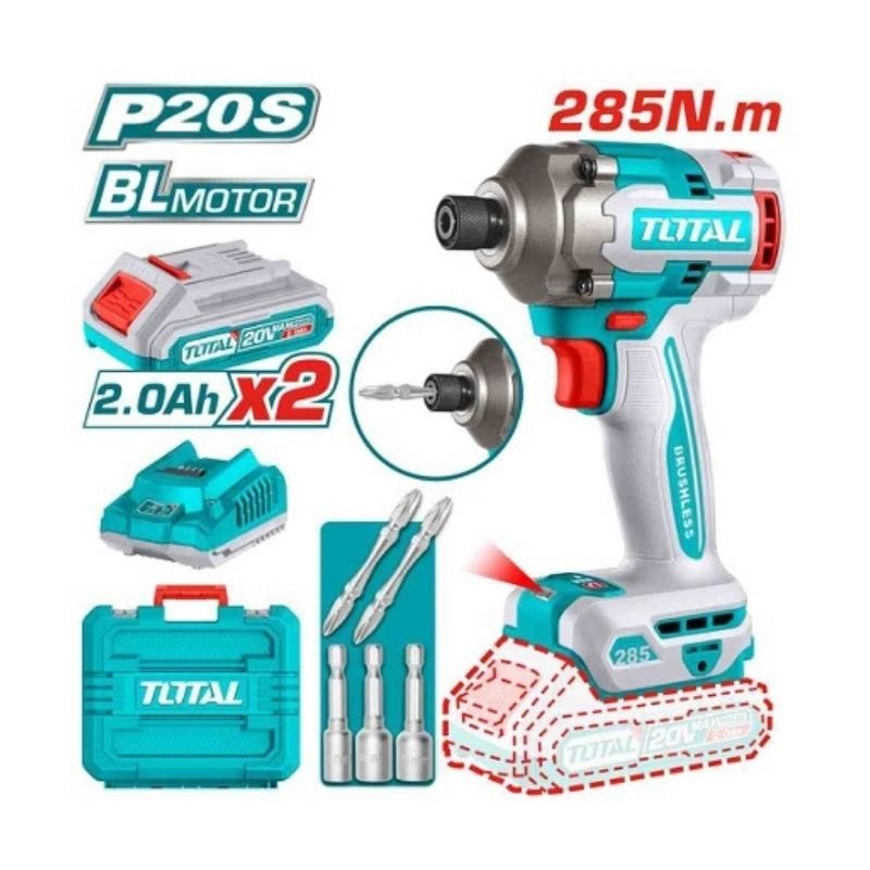 Brushless motor, voltage: 20V, hex shank: 1/4”, no-load speed: 0-1600/0-1900/0-2600rpm, impact rate: 0-2100/0-2500/0-2900bpm, max torque: 285Nm, integrated LED work light. Include: 2 Pcs screwdriver bits, 3 Pcs nut setters, 2 Pcs 2.0Ah battery pack, 1 Pcs charger. Charge volts: 110-120V~50/60Hz. Packed by carrying case.