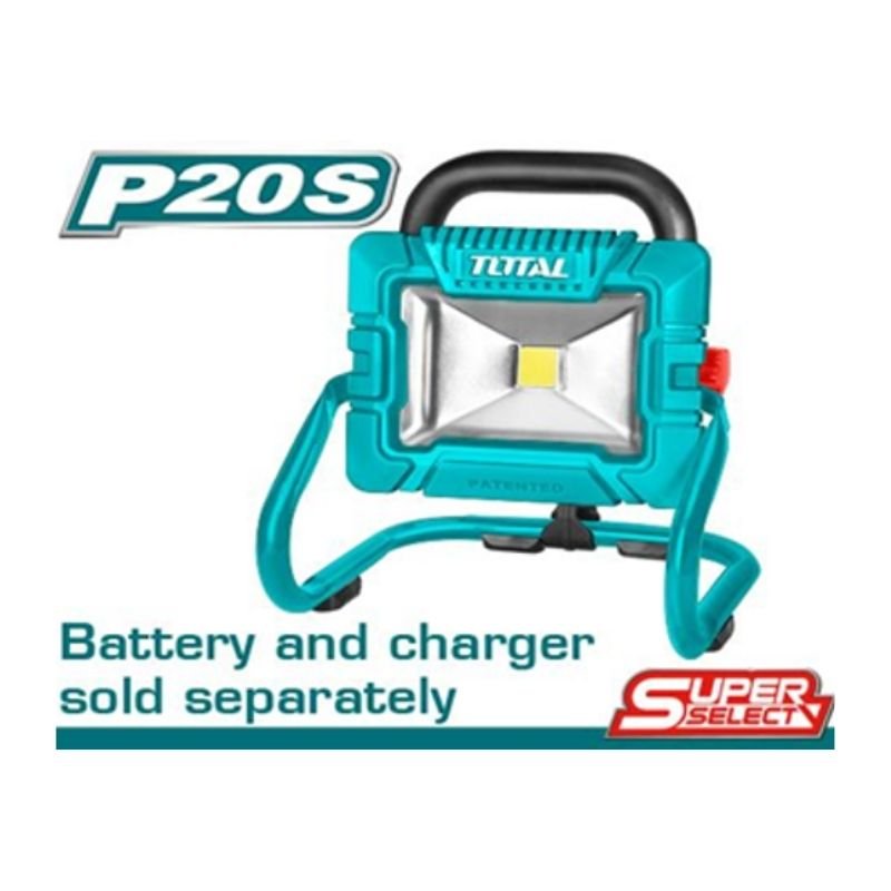 Voltage: 20V, LED power dissipation 20W, lumens output High: 1800 / Low: 900, includes 2Ah battery and charger, packed by color box.