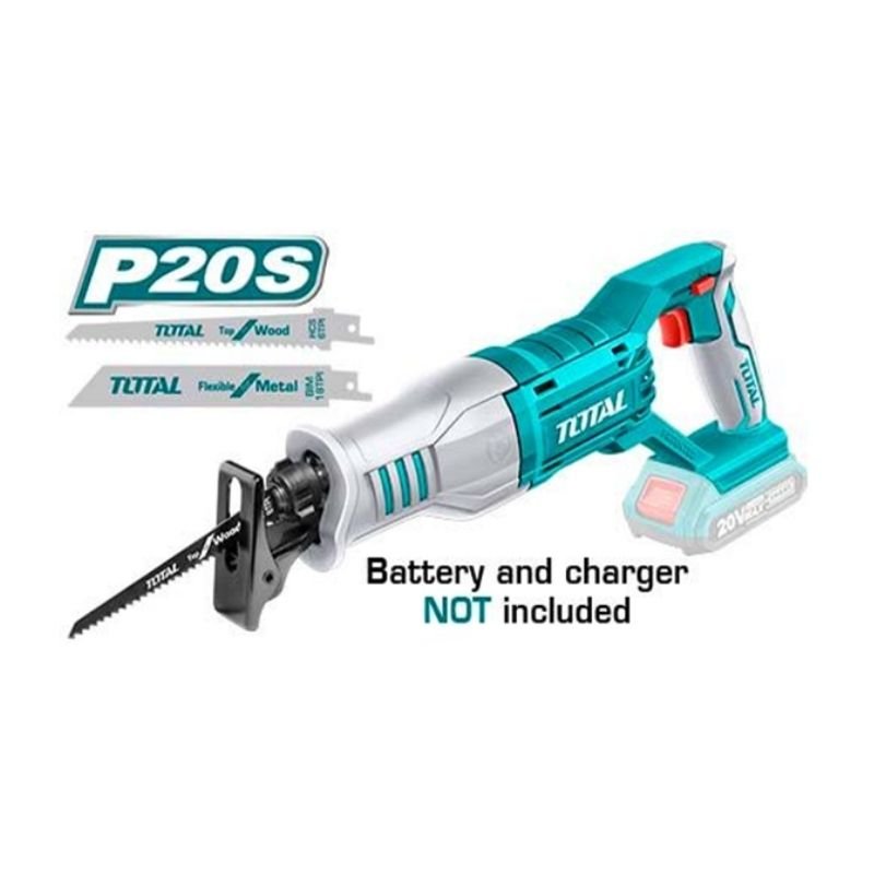 Voltage: 20V with a no-load speed of 0-2800/min and cutting capacity of 8mm in metal and 115mm in wood, supplied with 2 sabre saw blades, a 2Ah battery, and a charger, packed by color box.