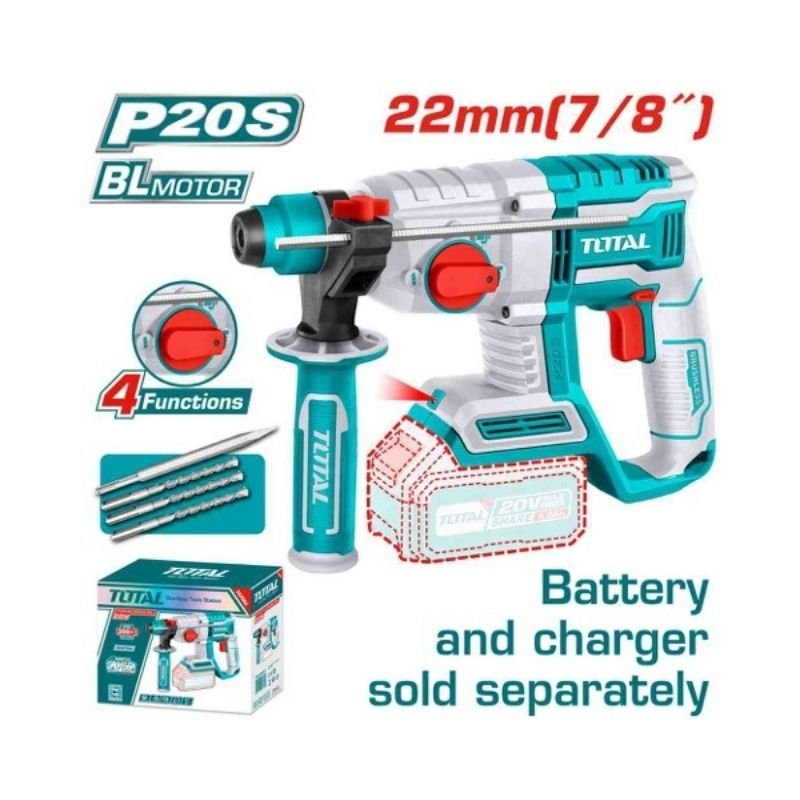 Brushless motor, voltage: 20V, no-load speed: 0-1100rpm, impact rate: 0-5400bpm, impact energy: 2.0J, max drilling capacity: concrete: 22mm, steel: 13mm, wood: 28mm, integrated work light, SDS Plus chuck system, 3pcs drill bits (6, 8, 10mm), 1pcs chisel, packed by color box.