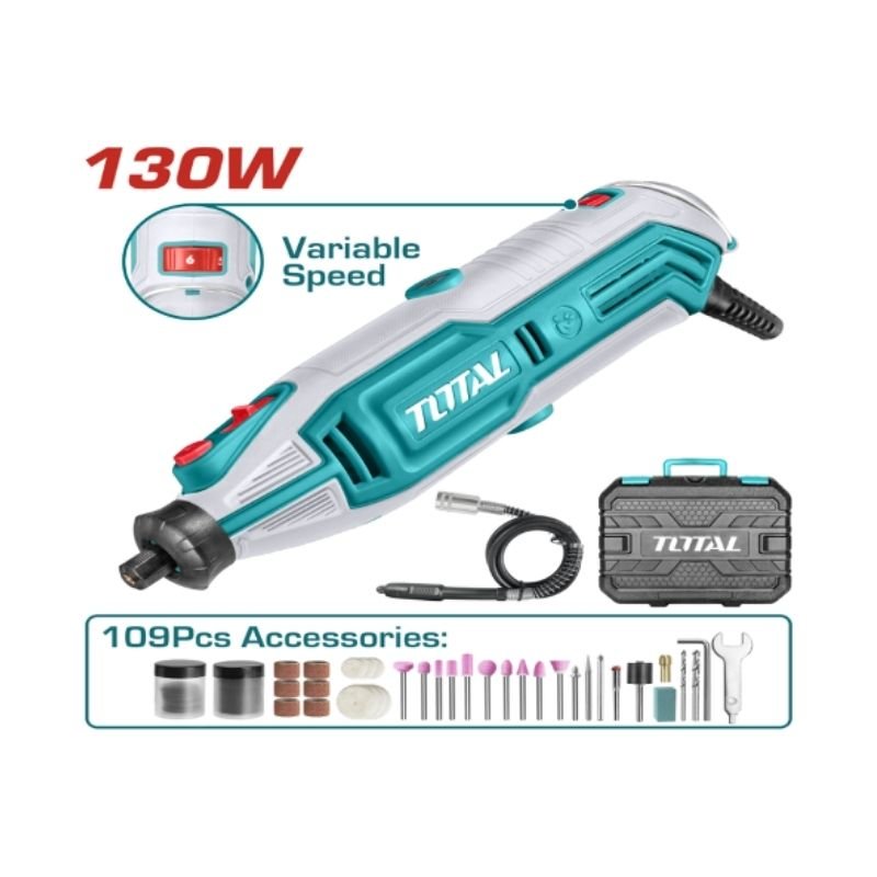 Volts: 110-120V~50/60Hz, Input power: 130W, No-load speed: 10000-35000rpm, Collet size: 1/8″/3/32″, variable speed control, with 1pcs flexible shaft, with 109pcs accessories, with 1set extra carbon brushes, packed by BMC.