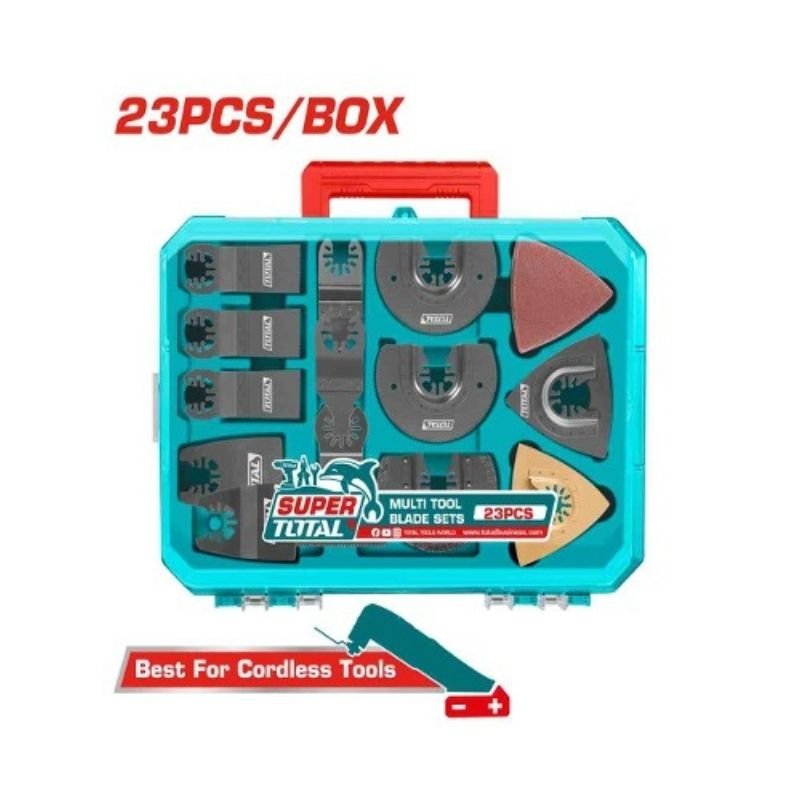 23 pcs per set. Includes: 10 pcs 80mm sandpaper (P60, P80, P120, P180, P240). 21 pcs delta sanding pad, size 80mm (3-1/8″). 1 pcs 78mm triangular carbide grout removal rasp. 1 pcs 88mm half grout removal blade. 1 pcs 87mm bi-metal (M42) saw blade. 1 pcs 87mm Cr-V saw blade. 1 pcs 10x40mm Cr-V saw blade. 1 pcs 20x40mm Cr-V saw blade. 2 pcs 34x40mm Cr-V saw blade. 1 pcs 34x40mm bi-metal (M42) saw blade. 1 pcs 65x50mm bi-metal (M42) saw blade. 1 pcs 50mm flexible scraper. 1 pcs 50mm rigid scraper. Packed by plastic box.
