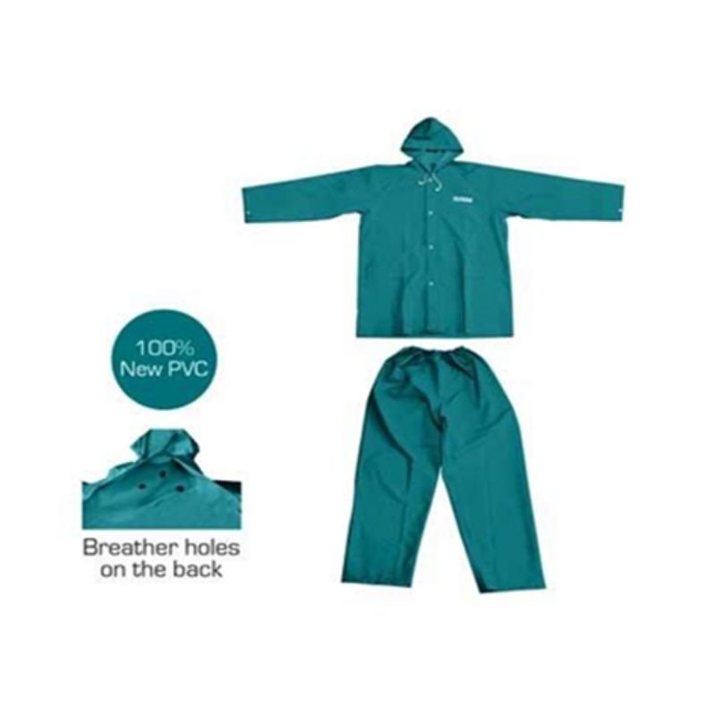 Material: PVC+Polyester, 100% new PVC Thickness: 0.33mm Size: L Waterproof with breather holes Two down pockets with flap Reflective strip at back Packed by poly bag.