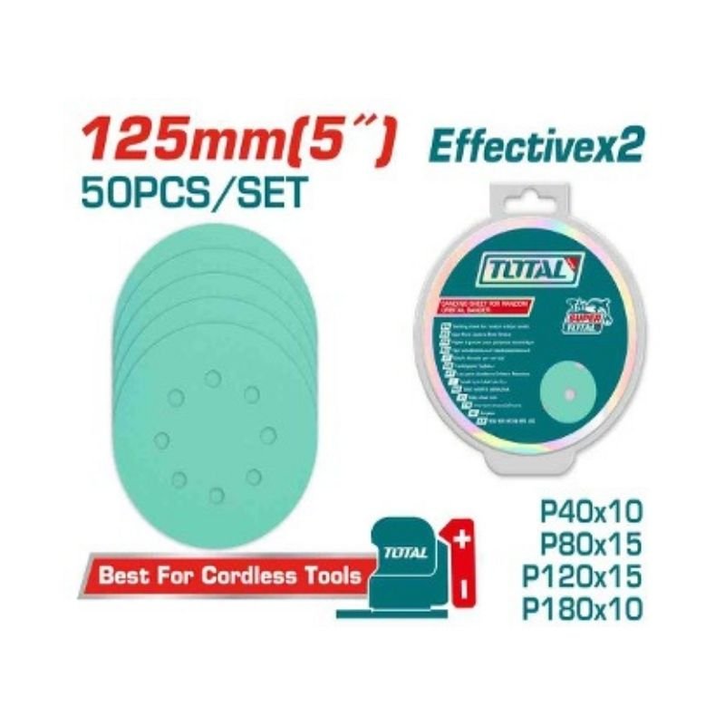 Size:125mm, 50pcs/set including P40×10pcs, P80×15pcs, P120×15pcs, and P180×10pcs, suitable for grinding wood, walls, paint, plastic, stone, metal, and glass.