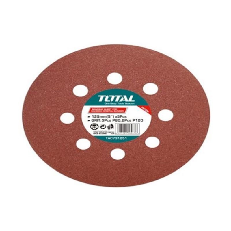 Size 125mm, 3pcs P80 and 2pcs P120, 5pcs per set, suitable for rotary sander TF2031256, packed by label.
