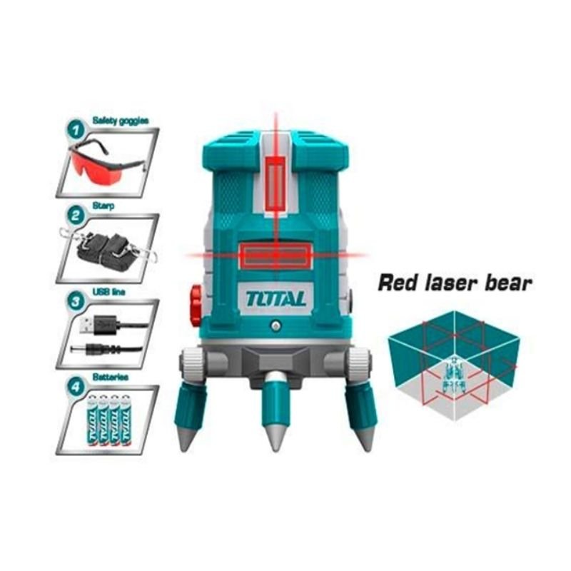 Working range 0–30m with one horizontal line and four vertical lines; levelling accuracy ±1.0mm at 5m and line accuracy ±1.5mm at 5m; levelling time under 3 seconds with a self-levelling range of ≤3°; red laser, Class 3R <5mW; compatible with TLLT01152 tripods (not included); features cross lock and laser gain functions; operating temperature 0 to +40°C and storage temperature -20 to +70°C; powered by four AA (1.5V) batteries; weight without batteries 980g; packed in a plastic box.