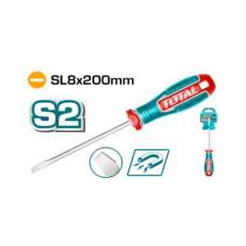 Blade material: S2, tip type: slotted SL8 (magnetic), tip size: 8.0mm, blade length: 200mm, blade diameter: 8.0mm, shank type: round, handle material: three-color ergonomic, with strong magnetic, supplied as 1pcs screwdriver with 1pcs plastic hanger and packed by plastic hanger.