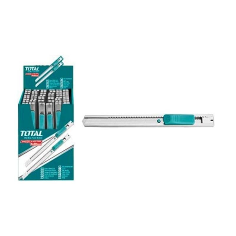 Blade size 9mm × 80mm with stainless steel body, includes 1pcs blade with auto-lock, length 130mm, with flat push button, packed in bulk.