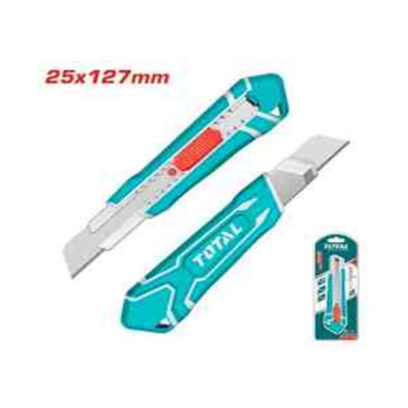 Blade size 25mm × 127mm with 1pcs blade, auto-lock, length 200mm, with flat push button, packed by double blister.