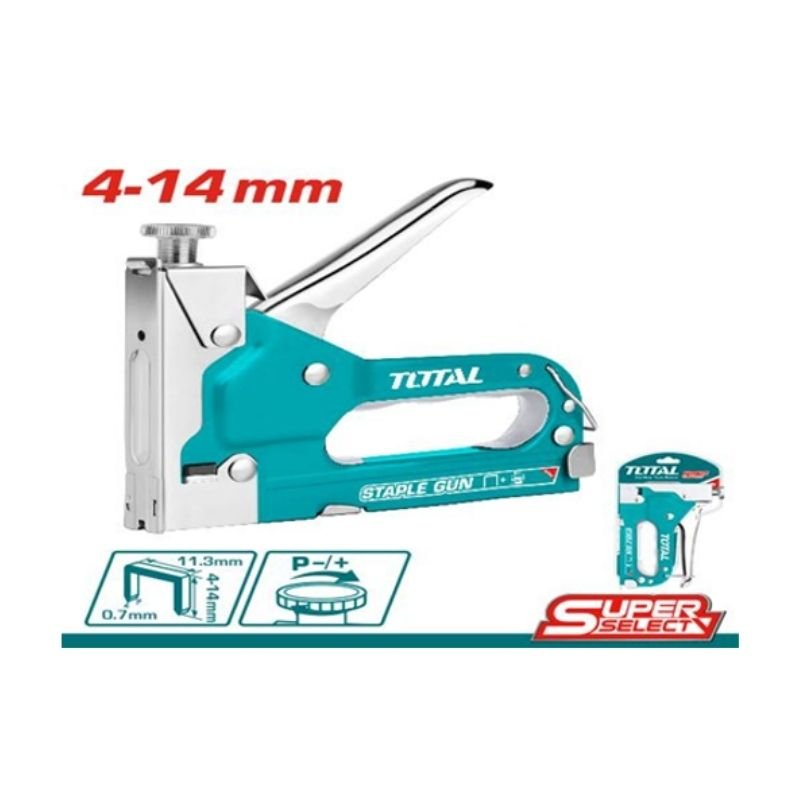 Iron staple gun with adjustable driving force, wire 0.7mm, crown 11.3mm, length 4–14mm, packed by double blister.