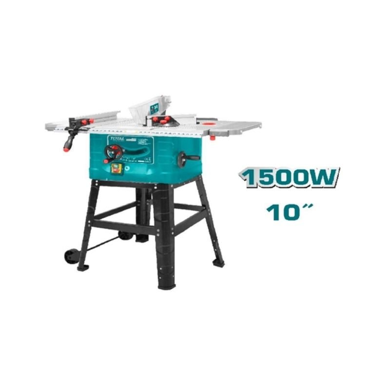 Table saw with 110–120V~60Hz voltage, 1500W input power, 4500rpm no-load speed, 10″×5/8″ blade size, 3-11/32″(90°) × 2-3/8″(45°) max cutting capacity, 0–45° blade tilting range, 16-59/64″×25-8/64″ main table size, 25-8/64″×6″ left/right extension table size, 16-59/64″×7-6/64″ rear extension table size, supplied with rip fence, push stick, and miter gauge, packed by carton box.
