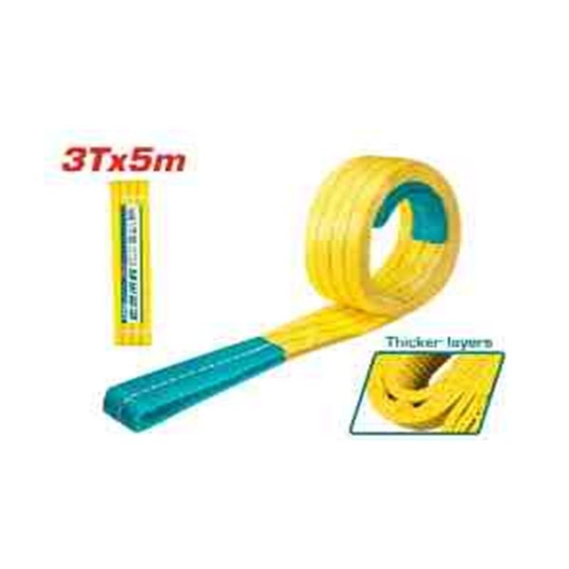 Load: 3T. Length: 5m. Width: 90mm. S.F.: 7:1. Economical & adaptable sling with no fixed wear points. Packed by poly bag.