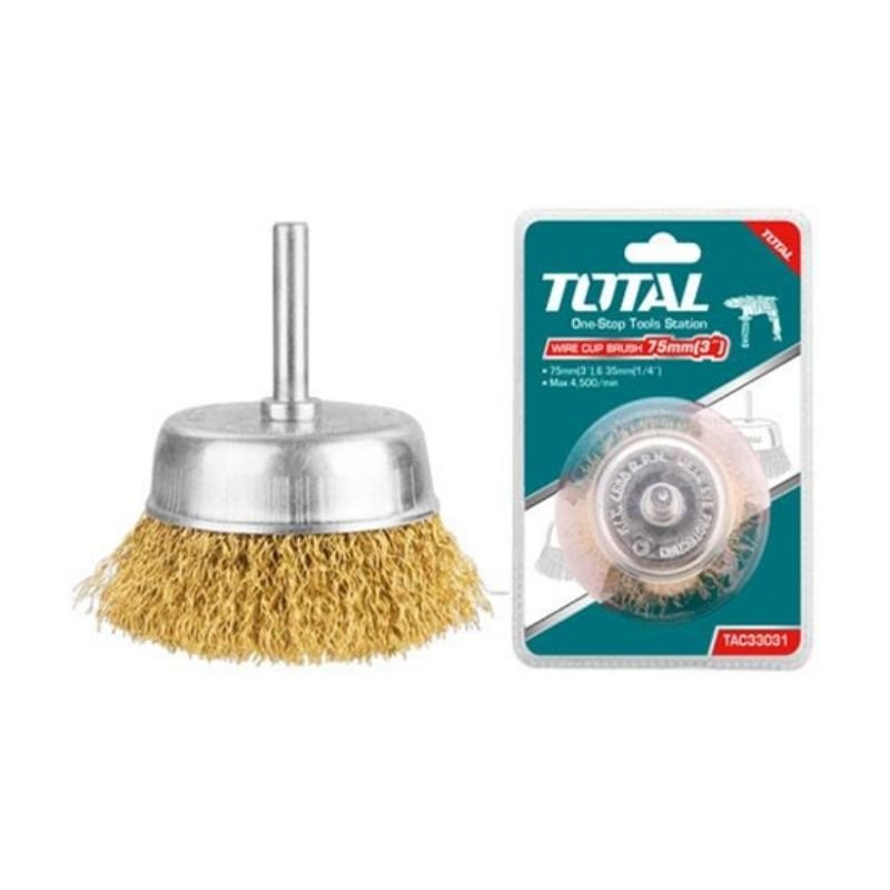 Shank dia.: 6mm, wire diameter: 0.3mm, size: 50mm, material: brass, max speed: 4500r/min, brand: TOTAL, warranty: 1 year, color: gold.